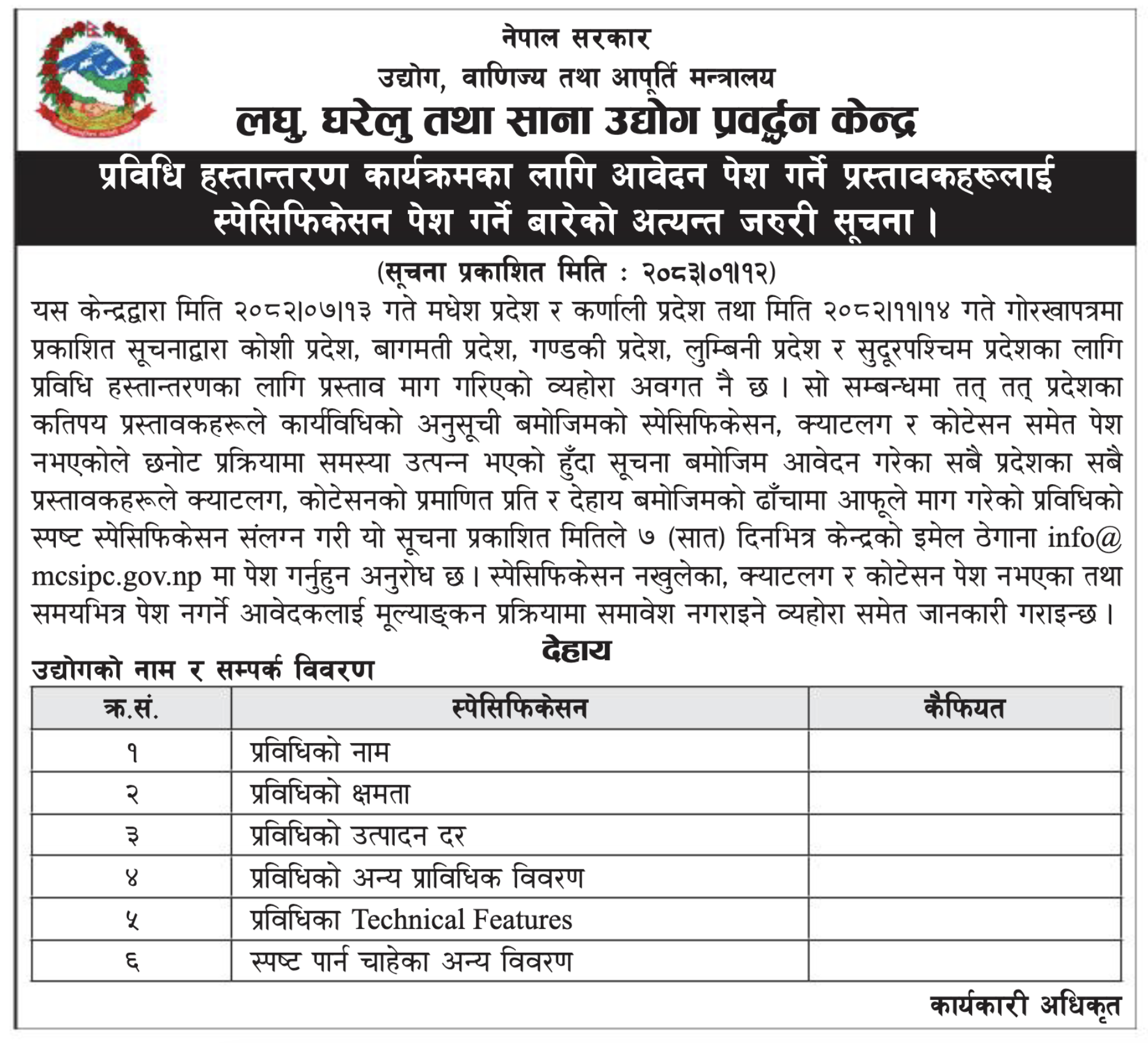 प्रविधि हस्तान्तरण कार्यक्रमका लागि आवेदन पेश गर्ने प्रस्तावकहरुलाई स्पेसिफिकेसन पेश गर्ने बारेको अत्यन्त जरुरी सूचना ।